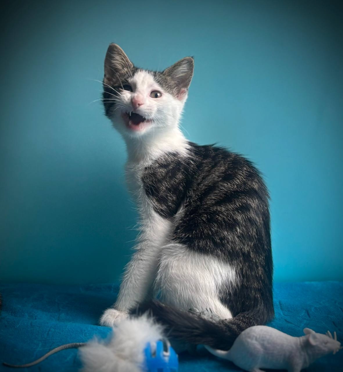 Мия не боится собак, живет с другими взрослыми кошками и со всем хорошо ладит.